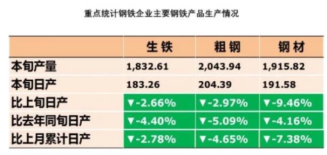 中國鋼鐵工業協會數據顯示,8月上旬,重點統計鋼鐵企業共生產粗鋼2043.94萬噸、生鐵1832.61萬噸、鋼材1915.82萬噸。其中,粗鋼日產204.39萬噸,環比下降2.97%、同比下降4.40%;生鐵日產183.26萬噸,環比下降2.66%、同比下降5.09%;鋼材日產191.58萬噸,環比下降9.46%、同比下降4.16%。
