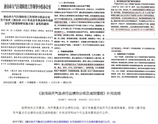 8月6日,唐山市印發(fā)《唐山市2022年北京冬奧會和冬殘奧會空氣質(zhì)量保障實施方案》征求意見稿;唐山市環(huán)保局發(fā)布了《重污染天氣重點行業(yè)績效分級及減排措施》補充說明。