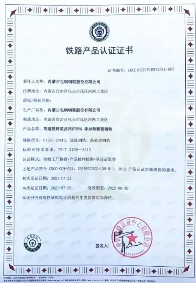 近日,從中鐵檢驗認證中心傳來喜訊,包鋼高速鐵路道岔用U75V非對稱斷面60AT2在線熱處理鋼軌正式獲得CRCC認證證書,標志著包鋼該產品正式具備在國內市場的供貨資質,填補自治區在該領域的產品空白。