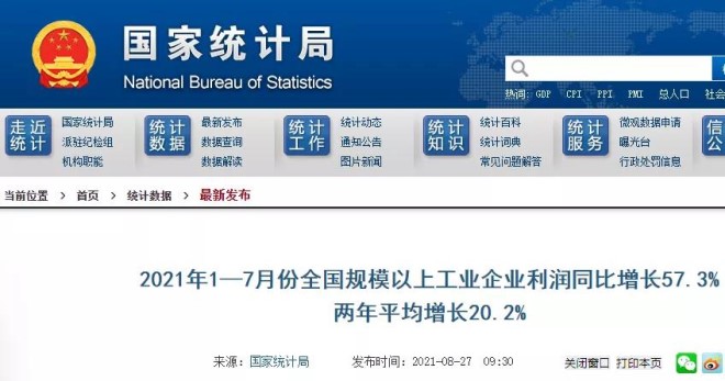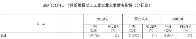 8月27日,國家統計局發布數據,1~7月份,全國規模以上工業企業實現利潤總額49239.5億元,同比增長57.3%(按可比口徑計算),比2019年1~7月份增長44.6%,兩年平均增長20.2%。其中,1~7月份,黑色金屬冶煉和壓延加工業營業收入為55642.7億元,同比增長46.0%;營業成本為50642.3億元,同比增長42.5;利潤總額達到2964.7億元,同比增長 181.6%。其利潤增幅在41個工業大類行業中僅次于化學纖維制造業(增長384.7%)、石油和天然氣開采業(增長266.7%)、有色金屬冶煉和壓延加工業(增長200.1%)、黑色金屬礦采選業(增長189.8%),排名第五。