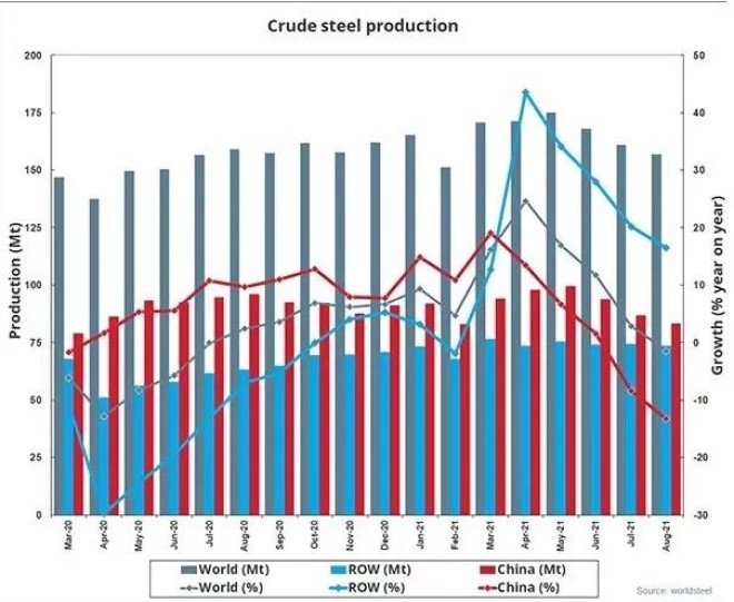 2021年8月份,全球64個納入世界鋼鐵協(xié)會統(tǒng)計國家的粗鋼產量為1.568億噸,同比下降1.4%。