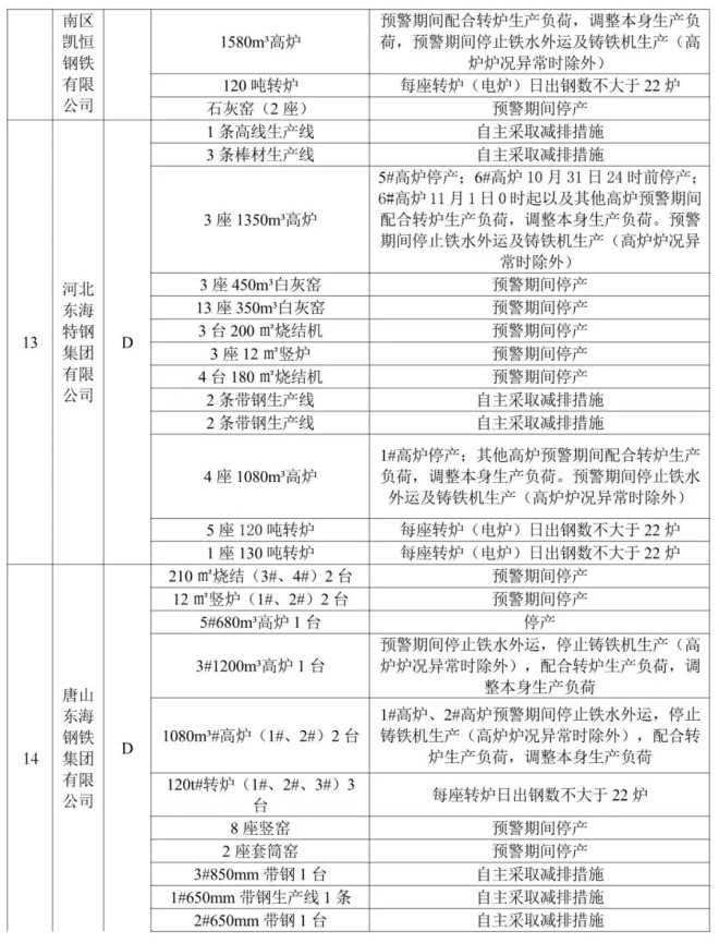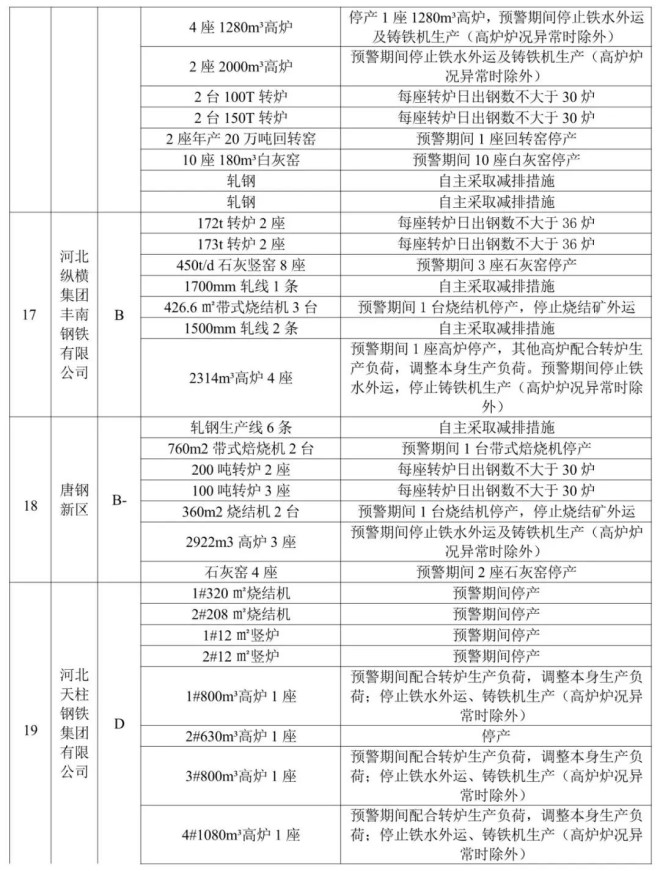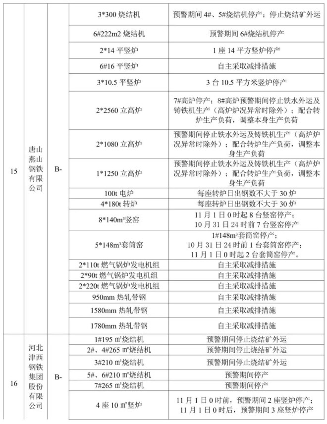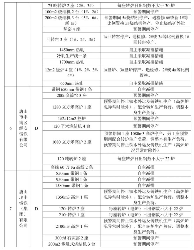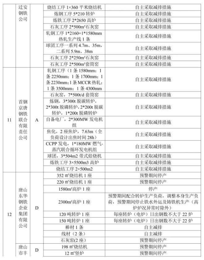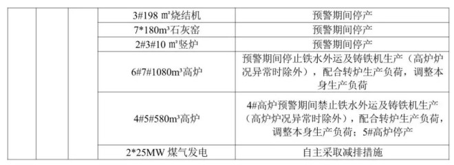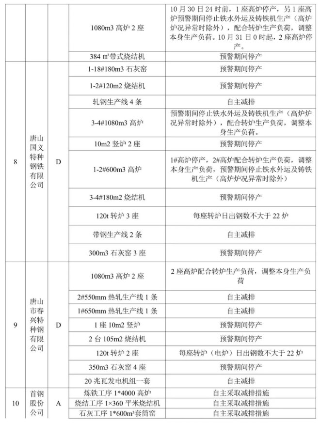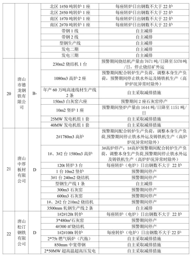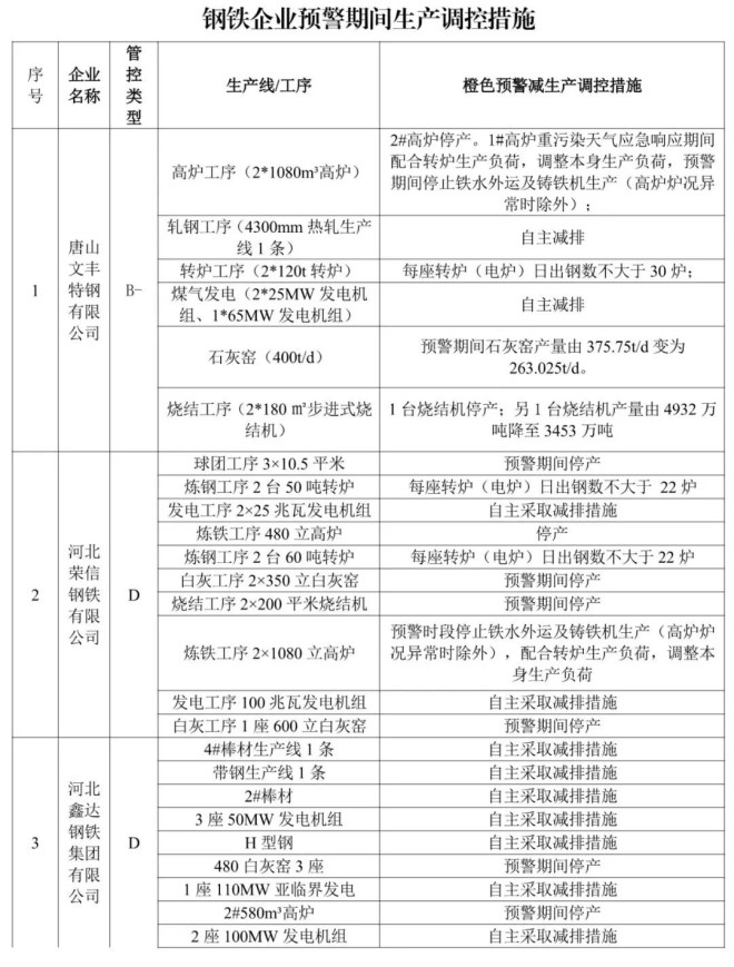 通知中提到,預(yù)警期間,唐山市將對(duì)鋼鐵企業(yè)生產(chǎn)采取以下調(diào)控措施: