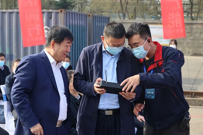 在隨后進行的新品發布會啟動儀式上,與會嘉賓共同見證了新能源純電動軌道牽引機車緩緩駛向會場,現場觀摩了車輛的空載和實載運行情況。
