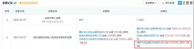 據企查查信息顯示,師宗縣沃萊迪金屬材料有限公司的股東信息已于10月27日完成信息變更。