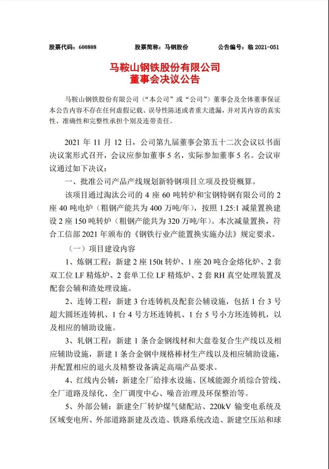 公告中表示,馬鞍山鋼鐵股份有限公司于11月12日以書面決議案形式召開了第九屆董事會第五十二次會議,會議審議通過了該公司新特鋼項目立項及投資概算。