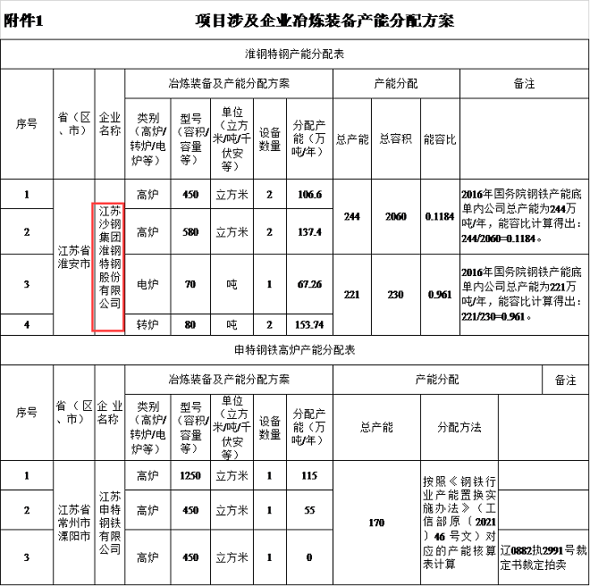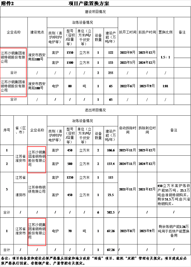 12月3日,江蘇省工信廳發布了《關于江蘇沙鋼集團淮鋼特鋼股份有限公司高爐電爐綠色升級改造項目產能置換方案的公示》(以下簡稱“《公示》”)。沙鋼集團具體產能分配、置換方案如下圖: