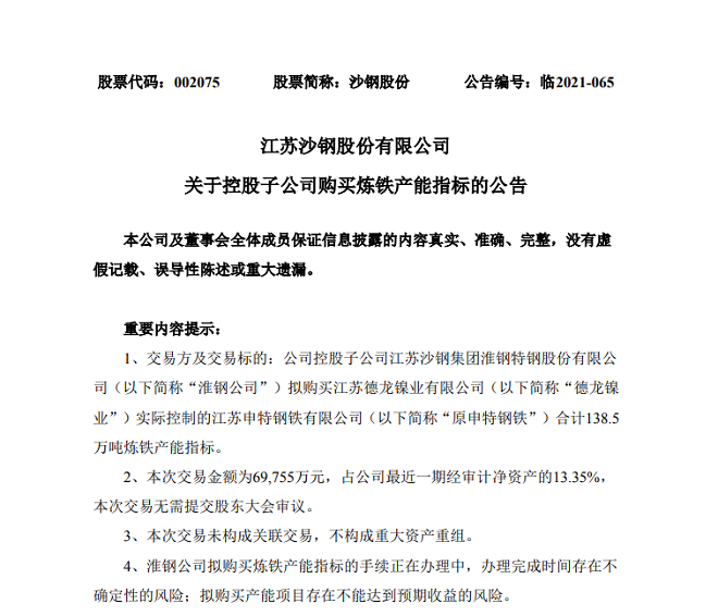 關于《公示》中提到的江蘇沙鋼集團淮鋼特鋼股份有限公司(以下簡稱“淮鋼公司”),由沙鋼股份于12月4日發布的公告中可知:淮鋼公司擬購買江蘇德龍鎳業有限公司實際控制的江蘇申特鋼鐵有限公司合計138.5萬噸煉鐵產能指標。