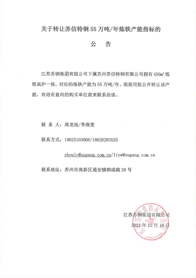 關于轉讓蘇信特鋼55萬噸/年煉鐵產能指標的公告