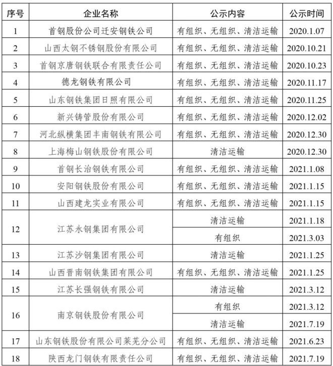 自2020年8月起,中國鋼鐵工業協會開展了鋼鐵企業超低排放改造和評估監測進展情況公示工作。截至目前,已有31家企業在鋼協網站進行公示。已公示企業名單匯總及各企業公示內容整理如下: