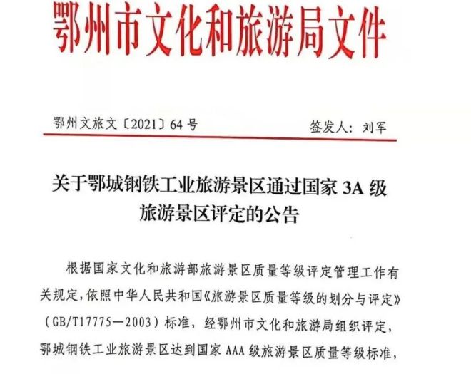 按照《旅游景區質量等級的劃分與評定》國家標準和《旅游景區質量等級管理辦法》,鄂城鋼鐵積極推進工業旅游3A級景區達標創評工作,并于2021年12月23日被正式確定為國家3A級旅游景區。