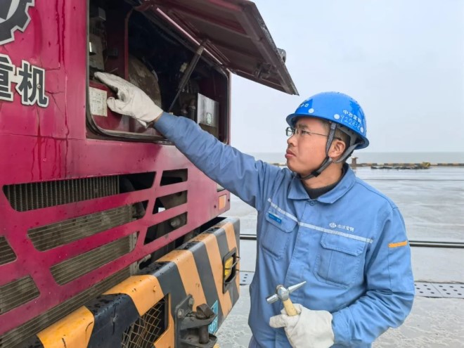 中冶寶鋼綜合碼頭港機作業區域”機長“登上港機準備工作