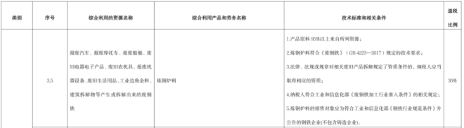綜合利用的資源名稱、綜合利用產品和勞務名稱、技術標準和相關條件、退稅比例等按照此公告所附《資源綜合利用產品和勞務增值稅優惠目錄(2022年版)》的相關規定執行。其中,廢鋼鐵適用于表內3.5,規定退稅30%政策進一步加嚴,需具備兩個條件: