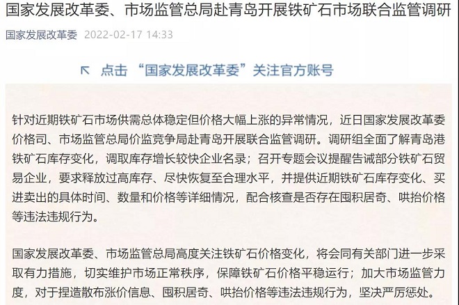 2月17日下午2點(diǎn)33分,國家發(fā)展改革委官微就鐵礦石價(jià)格異動(dòng)再次發(fā)文稱,近日國家發(fā)展改革委價(jià)格司、市場監(jiān)管總局價(jià)監(jiān)競爭局赴青島開展鐵礦石市場聯(lián)合監(jiān)管調(diào)研。