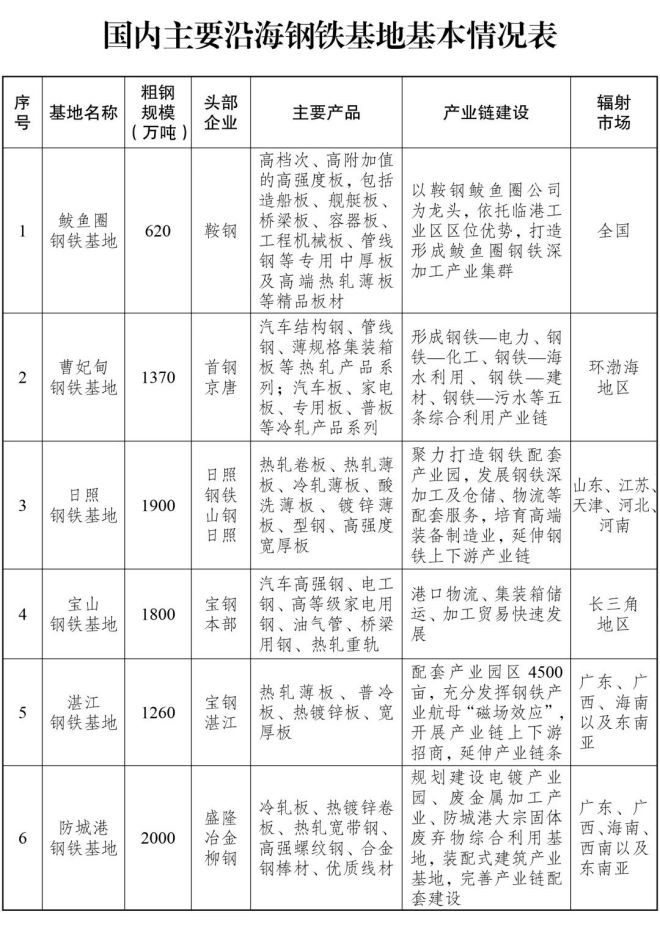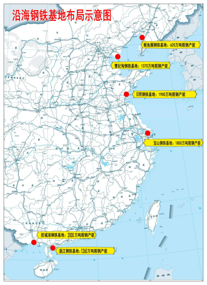 由資源型布局向沿海臨港型布局轉型,是中國鋼鐵產業正在經歷的深刻變革。進入新世紀以來,我國已經興建了遼寧省鲅魚圈、河北曹妃甸、山東日照、廣東湛江、廣西防城港5個重要的沿海鋼鐵生產基地,加上原有的寶山鋼鐵基地,目前六大沿海鋼鐵生產基地均已投產,總的鋼鐵產能已近9000萬噸,輻射市場遍及全國。同時,樂亭、鹽城、南通、福州等沿海地區仍在建設一批大型鋼鐵項目。