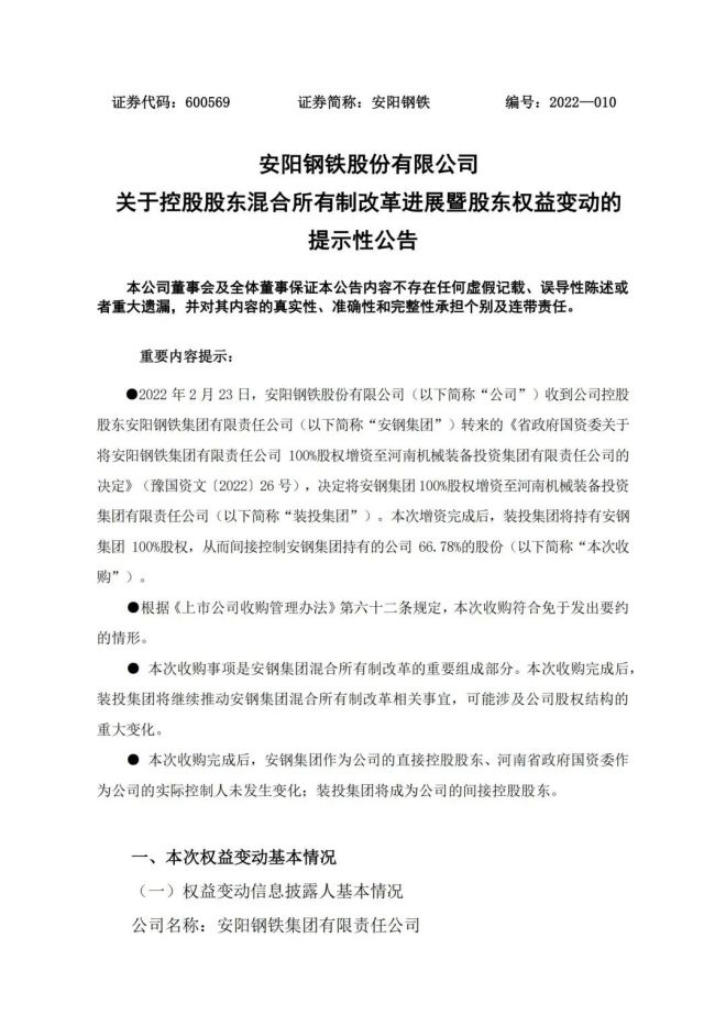 2月23日,安陽鋼鐵股份有限公司(以下簡稱公司)發布《關于控股股東混合所有制改革進展暨股東權益變動的提示性公告》,表示收到公司控股股東安陽鋼鐵集團有限責任公司(以下簡稱安鋼集團)轉來的《省政府國資委關于將安陽鋼鐵集團有限責任公司100%股權增資至河南機械裝備投資集團有限責任公司的決定》(豫國資文〔2022〕26 號),決定將安鋼集團100%股權增資至河南機械裝備投資集團有限責任公司(以下簡稱裝投集團)。本次增資完成后,裝投集團將持有安鋼集團100%股權,從而間接控制安鋼集團持有的公司66.78%的股份(以下簡稱本次收購)。本次收購事項是安鋼集團混合所有制改革的重要組成部分。本次收購完成后,裝投集團將繼續推動安鋼集團混合所有制改革相關事宜,可能涉及公司股權結構的重大變化。
