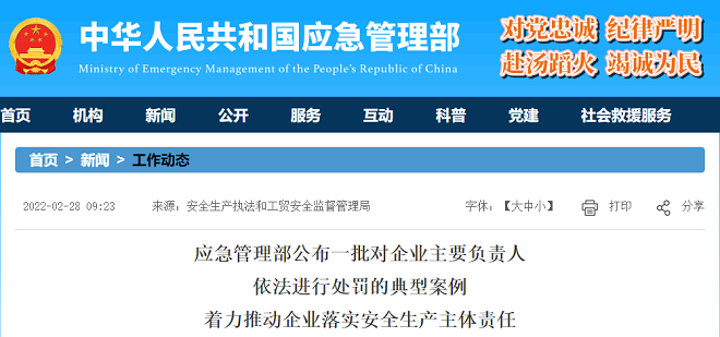 2月28日,中華人民共和國應急管理部網站發布了《應急管理部公布一批對企業主要負責人依法進行處罰的典型案例 著力推動企業落實安全生產主體責任》(以下簡稱:“《案例》”)?!栋咐饭剂艘慌鷮ζ髽I主要負責人依法進行處罰的典型案例,推動企業主要負責人依法履職盡責,全面落實安全生產主體責任,不斷提升企業本質安全水平。