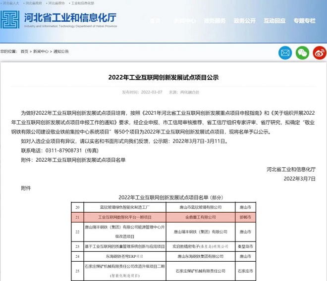 好雨知時節(jié),捷報頻相傳。2022年3月,河北省工業(yè)和信息化廳發(fā)布公示,50個項目為2022年工業(yè)互聯(lián)網創(chuàng)新發(fā)展試點項目,其中金鼎鋼鐵集團有限公司(以下簡稱金鼎鋼鐵集團)《工業(yè)互聯(lián)網數(shù)智化平臺一期項目》獲此殊榮。