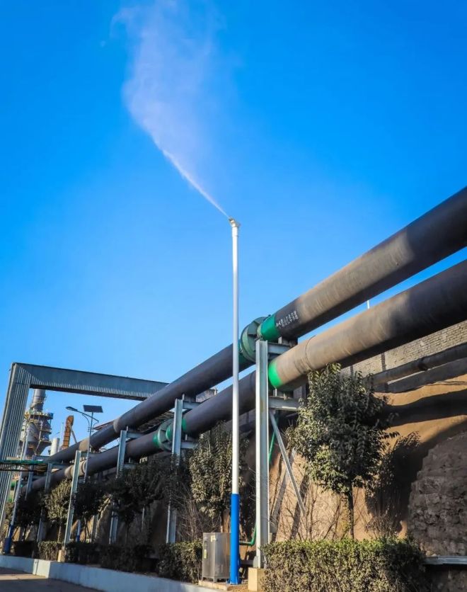 該系統相比傳統的抑塵霧炮車、灑水車要方便很多,省去了大功率風機設備,大大減少了設備噪音,大部分情況下可以代替其進行道路或者廠區的降塵除霾清潔等作業。目前,環保霧樁已全部調試完畢可正常使用,實現廠區全覆蓋,做到廠區空氣質量更優。