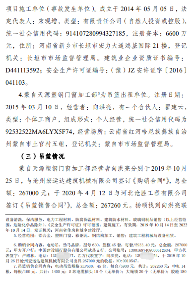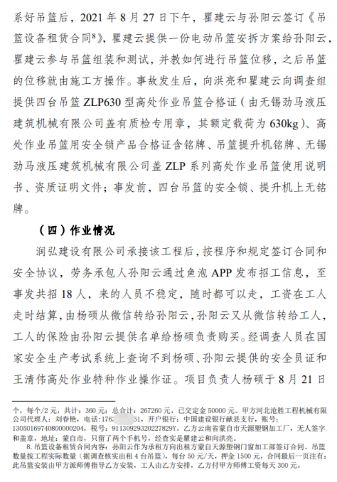 2021年7月26日,紅河鋼鐵有限公司通過招標方式,將“七萬立方米煤氣柜防腐”項目交由云南昆鋼有限公司承接,后該公司通過邀標比價方式將該項目交由河南某公司承接,河南某公司經理將該項目全權交由不具備相關資質的被告人楊某來負責,而楊某又以總人工工價15萬元的價格將工程交給被告人孫某負責施工。2021年8月24日,被告人孫某帶工人正式進入紅鋼公司動力能源廠煤氣儲備站進行除銹、防腐作業。同年9月30日13時10分許,因相關作業人員違章操作施工吊籃,且嚴重超員使用施工吊籃,導致施工現場發生安全事故,造成現場作業人員五人連同吊籃一起從煤氣柜頂部墜落地面,致使該五名施工人員當場死亡。同時兩被告人楊某、孫某還為負責施工的工作人員偽造了特種作業操作證。