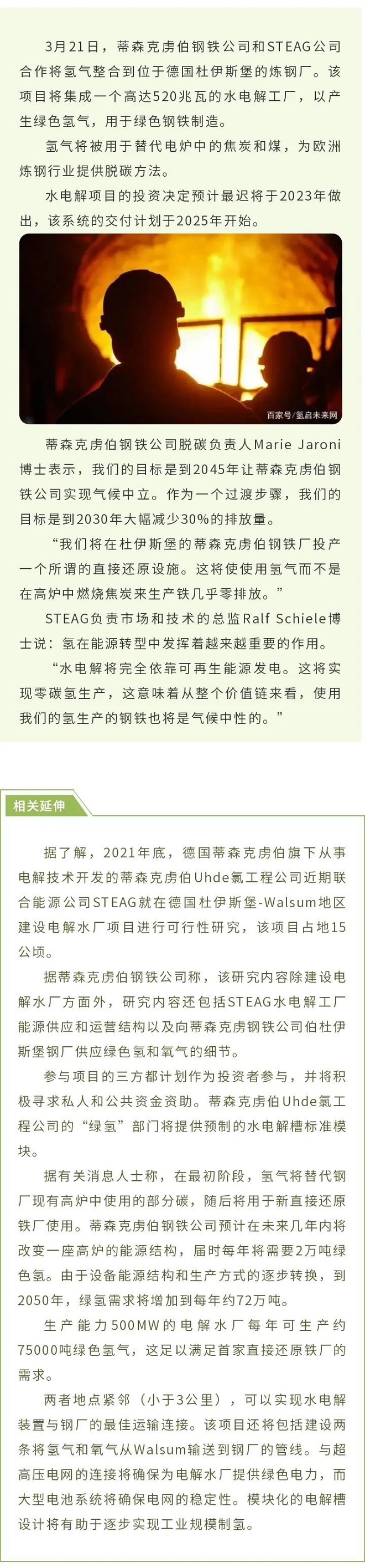 蒂森克虜伯鋼鐵公司攜手STEAG制氫,計劃2025年開始交付