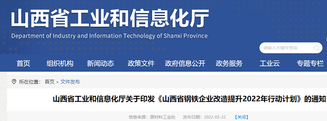 3月22日,山西省工業和信息化廳官網發布了關于印發《山西省鋼鐵企業改造提升2022年行動計劃》(以下簡稱《行動計劃》)的通知。