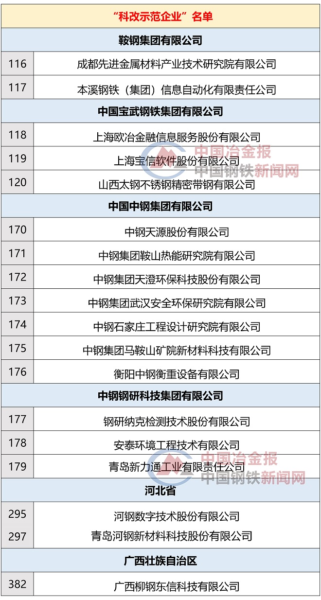 從《名單》中獲悉,此次入選“科改示范企業”名單共有440家,其中鞍鋼集團、中國寶武鋼鐵集團、中國中鋼集團、中國鋼研科技集團、河鋼集團、柳鋼集團等18家鋼鐵企業(含下屬企業)上榜。
