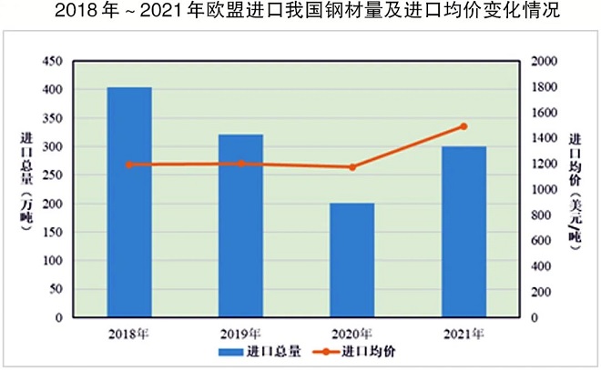 近年來,受歐盟對我國鋼材多次以反傾銷為由征收高額關稅、新冠肺炎疫情蔓延等因素影響,歐盟自我國進口的鋼材總量整體呈下降趨勢。2021年,歐盟經濟恢復帶動鋼鐵需求持續復蘇,鋼材價格普遍上漲,我國出口歐盟的鋼材均價達到1493美元/噸,出口價格優勢階段性顯現。2021年,歐盟從我國進口鋼材量達到300萬噸,同比增長49.7%,但仍較2019年下降6.6%。2018年~2021年歐盟進口我國鋼材量及進口均價變化情況如下圖。