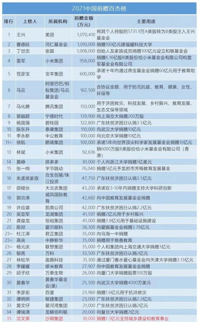 注2:本榜單統計的外幣捐贈,統一按2021年12月31日的中國銀行(3.290, 0.01, 0.30%)外匯中間價計算。