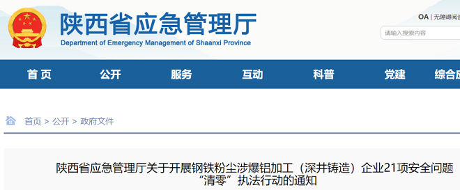 為認真貫徹國務院安委會關于安全生產“十五條硬措施”和陜西省開展安全生產大檢查工作部署,督促鋼鐵、粉塵涉爆、鋁加工(深井鑄造)企業嚴格落實安全生產主體責任,全面整治安全隱患問題,有效遏制較大以上生產安全事故,確保工貿重點企業安全生產專項整治三年行動取得預期效果,陜西省應急管理廳決定:4月20日至6月20日,在全省開展鋼鐵、粉塵涉爆、鋁加工(深井鑄造)企業21項安全問題“清零”執法行動。