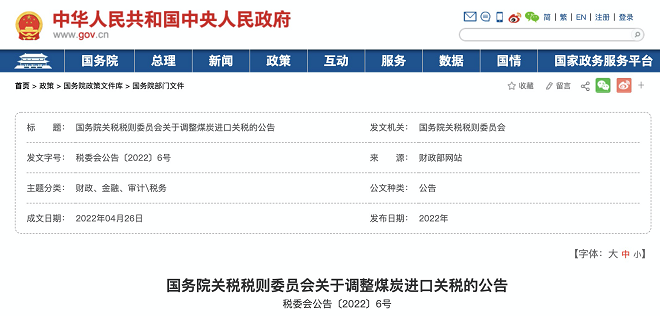 從《公告》中獲悉,為加強能源供應保障,推進高質量發展,國務院關稅稅則委員會按程序決定,自2022年5月1日至2023年3月31日,對煤炭實施稅率為零的進口暫定稅率。