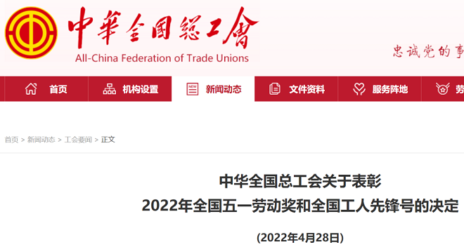 4月28日,中華全國總工會發布公告:為進一步增強新時代工人階級的自豪感和使命感,營造勞動光榮的社會風尚和精益求精的敬業風氣,中華全國總工會決定,授予北京奧林匹克公園管理委員會等200個單位全國五一勞動獎狀,授予鄒平等966名職工全國五一勞動獎章,授予北京市西城區疾病預防控制中心疫情防控應急隊等956個集體全國工人先鋒號。