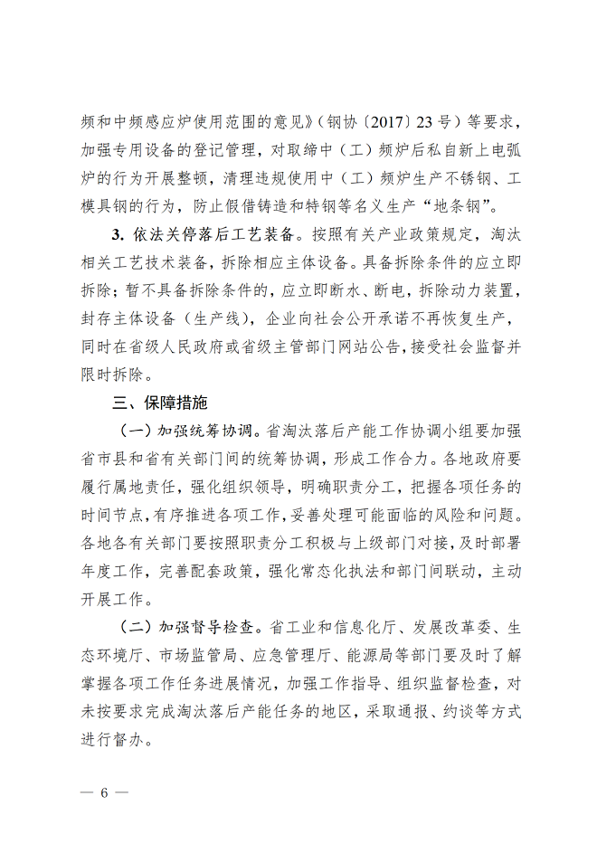 《方案》強調,嚴防“地條鋼”死灰復燃。加強專用設備的登記管理,對取締中(工)頻爐后私自新上電弧爐的行為開展整頓,清理違規使用中(工)頻爐生產不銹鋼、工模具鋼的行為,防止假借鑄造和特鋼等名義生產“地條鋼”。