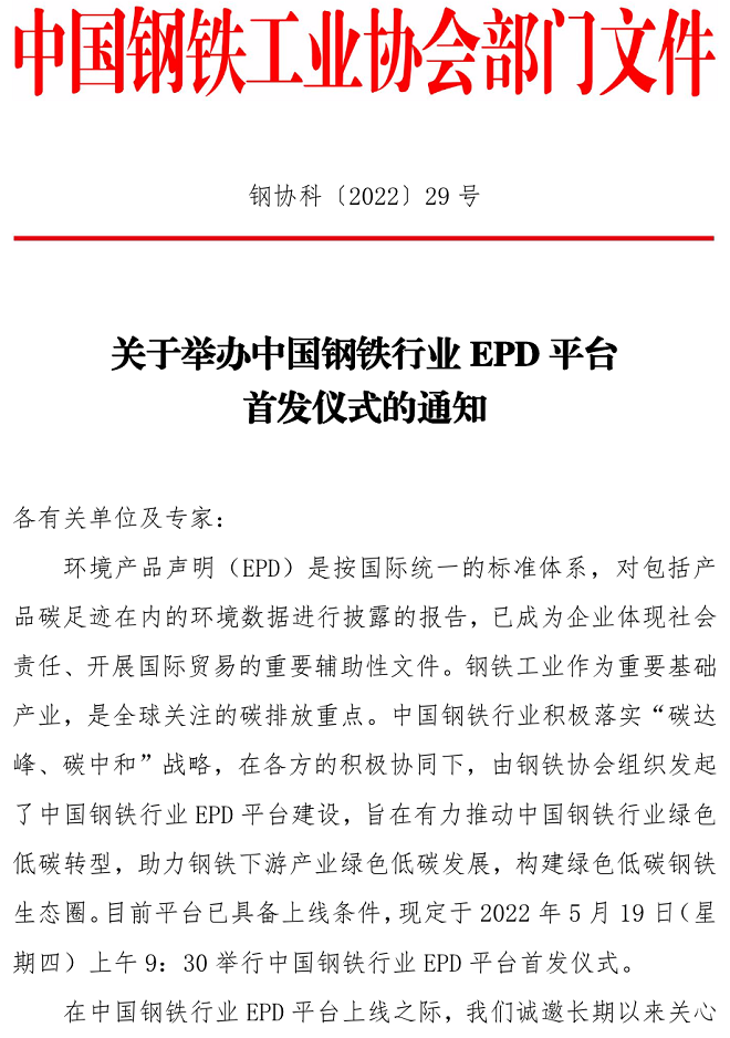 中國鋼鐵行業EPD平臺首發儀式即將開播