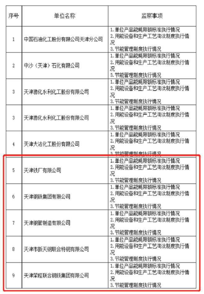 天津市發改委印發2022年節能監察計劃,對2020年、2021年竣工投產的由市級部門審批、核準、備案或由市發展改革委進行節能審查的固定資產投資項目,按照“雙隨機、一公開”監管機制進行抽查,對屬于石化、煤化工、化工、鋼鐵、焦化、火力發電、建材、有色金屬等高耗能行業和數據中心的項目加大抽查比例,抽查項目不少于15個。其中,市級重點用能單位節能監察計劃中,涉及天津鐵廠有限公司、天津鋼鐵集團有限公司、天津鋼管制造有限公司等5家鋼企。