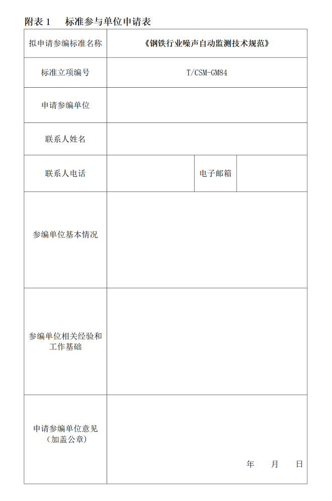 根據生態環境部發布的《排污單位自行監測技術指南 鋼鐵工業及煉焦化學工業》,鋼鐵行業屬于噪聲重點排污單位,需要自行建立噪聲自動監測系統。因此,中國金屬學會開展《鋼鐵行業噪聲自動監測技術規范》的制訂工作。本標準依據《工業企業廠界環境噪聲排放標準》GB12348-2008、《環境噪聲監測技術規范 噪聲測量值修正》HJ706-2014、《功能區聲環境質量自動監測技術規范》HJ906-2017、《環境噪聲自動監測系統技術要求》HJ907-2017、相關內容,合理評估鋼鐵行業對周邊環境及人群的實際影響,現面向會員單位及相關單位公開征集立項研究及標準參與單位。參與單位申請表見附表1。