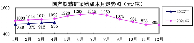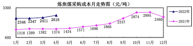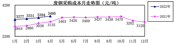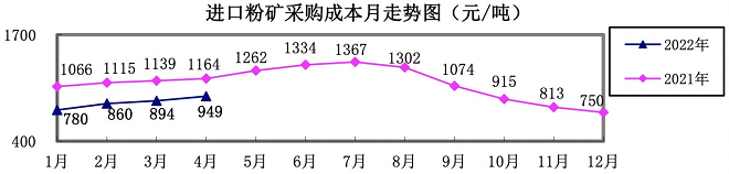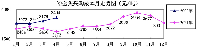 2022年4月,煤焦和鐵礦石、廢鋼采購成本繼續上升。