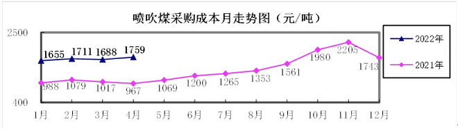 噴吹煤4月份加權平均折算成干基的采購成本為1759.47元/噸,環比升高71.86元/噸,升幅為4.26 %。1-4月累計平均折算成干基的采購成本為1692.66元/噸,同比升高678.56元/噸,升幅為66.91%。