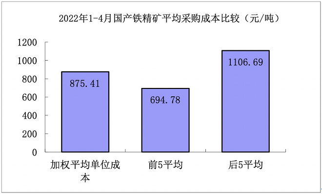 1-4月對標企業國產鐵精礦折算成62%品位的平均采購成本為875.41元/噸,成本最低的前5家企業的加權平均采購成本為694.78元/噸,比對標企業平均采購成本低180.64元/噸,低于平均采購成本20.63%;而采購成本最高的5家企業的加權平均采購成本為1106.69元/噸,比對標企業平均采購成本高231.27元/噸,高于平均采購成本26.42%。