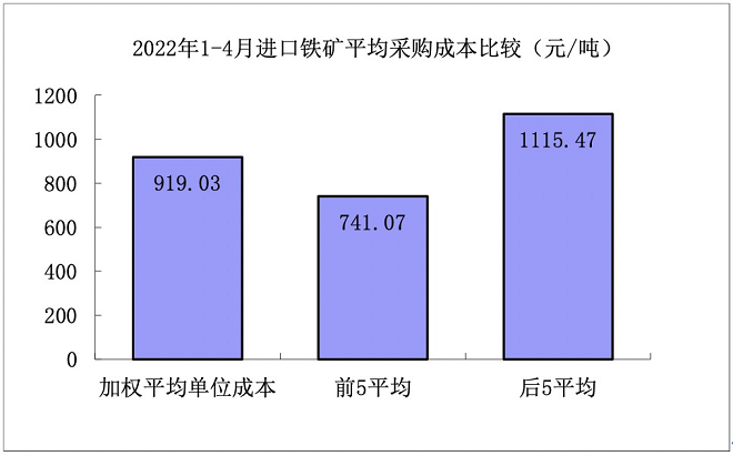1-4月對標企業進口粉礦折算成62%品位的平均采購成本為876.94元/噸,成本最低的前5家企業的加權平均采購成本為709.11元/噸,比對標企業平均采購成本低167.83元/噸,低于平均采購成本19.14%;而采購成本最高的5家企業加權平均采購成本為1070.58元/噸,比對標企業平均采購成本高193.64元/噸,高于平均采購成本22.08%。