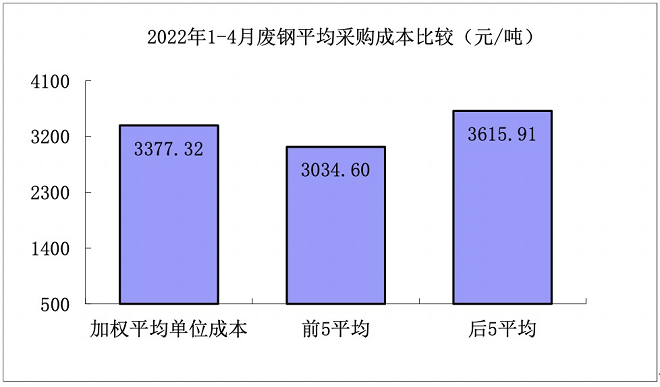 1-4月對標企業廢鋼平均采購成本最低的前5家企業的加權平均采購成本為3034.60元/噸,比對標企業平均采購成本低342.72元/噸,低于平均采購成本10.15%;而采購成本最高的5家企業加權平均采購成本為3615.91元/噸,比對標企業平均采購成本高238.58元/噸,高于平均采購成本7.06%。