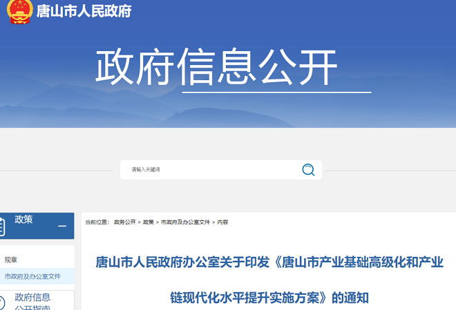 近日,唐山市人民政府網站公布了關于印發《唐山市產業基礎高級化和產業鏈現代化水平提升實施方案》(以下簡稱《方案》)的通知。