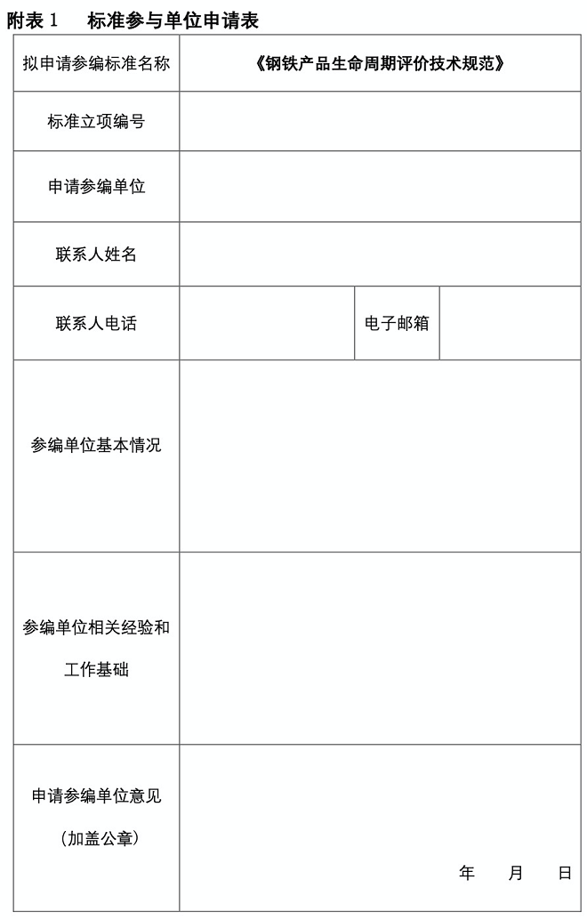 中國金屬學會現繼續面向會員單位及相關單位公開征集鋼鐵產品全生命周期標準制訂參與單位。參與單位申請表見附表1。