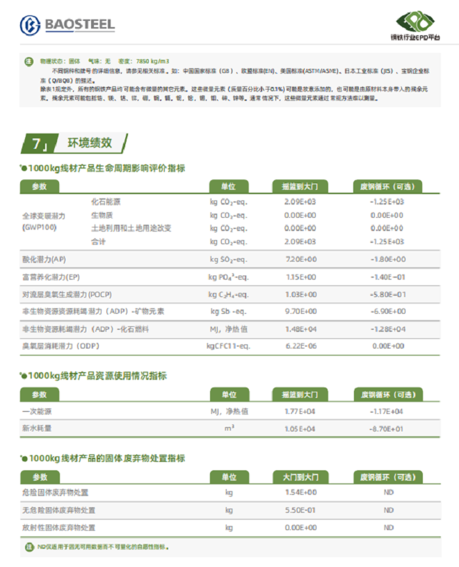 圖為寶鋼股份線材產(chǎn)品EPD中的環(huán)境績效頁截圖。