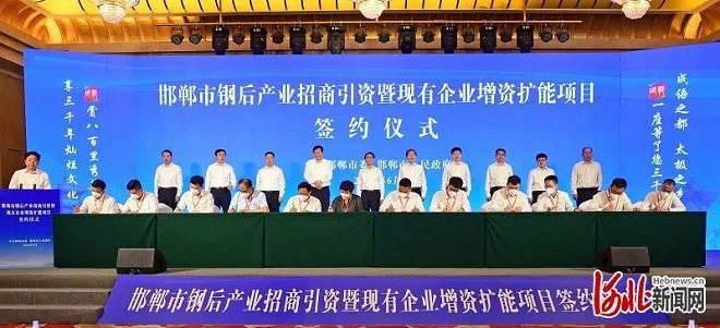 6月11日上午,河北省邯鄲市舉辦鋼后產(chǎn)業(yè)招商引資暨現(xiàn)有企業(yè)增資擴(kuò)能項(xiàng)目簽約儀式,來(lái)自湖南、江蘇等地的7家企業(yè)與該市10家鋼鐵骨干企業(yè)及配套關(guān)聯(lián)企業(yè)共簽約項(xiàng)目17個(gè),總投資316.6億元,將助力邯鄲產(chǎn)業(yè)轉(zhuǎn)型升級(jí)。