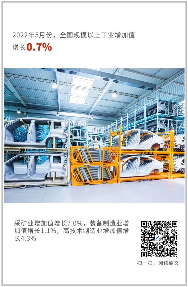 5月份,全國規模以上工業增加值同比增長0.7%,4月份為下降2.9%;環比增長5.61%。分三大門類看,采礦業增加值同比增長7.0%,制造業增長0.1%,電力、熱力、燃氣及水生產和供應業增長0.2%。