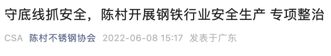 近日,佛山市順德區(qū)陳村不銹鋼協(xié)會(huì)公眾號(hào)發(fā)布了《守底線抓安全,陳村開(kāi)展鋼鐵行業(yè)安全生產(chǎn)專(zhuān)項(xiàng)整治》一文。從文中獲悉,為深刻汲取近期安全生產(chǎn)事故教訓(xùn),進(jìn)一步加大鋼鐵加工行業(yè)核查、整治力度,有效落實(shí)全鎮(zhèn)安全生產(chǎn)防范工作,6 月 7 日下午,陳村鎮(zhèn)應(yīng)急管理辦對(duì)潭村工業(yè)園區(qū)鋼鐵企業(yè)開(kāi)展專(zhuān)項(xiàng)檢查。