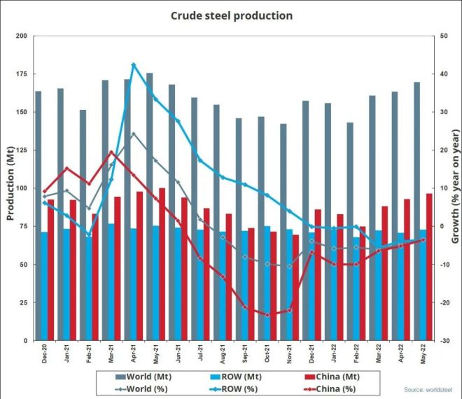 2022年5月全球64個(gè)納入世界鋼鐵協(xié)會(huì)統(tǒng)計(jì)國(guó)家的粗鋼產(chǎn)量為1.695億噸,同比下降3.5%。