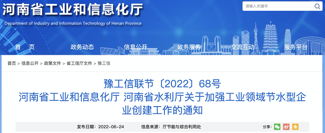 6月24日,河南省工業(yè)和信息化廳、河南省水利廳發(fā)布了《關(guān)于加強(qiáng)工業(yè)領(lǐng)域節(jié)水型企業(yè)創(chuàng)建工作的通知》(以下簡(jiǎn)稱《通知》),推進(jìn)重點(diǎn)用水工業(yè)領(lǐng)域節(jié)水型企業(yè)建設(shè),促進(jìn)企業(yè)對(duì)標(biāo)達(dá)標(biāo),加快轉(zhuǎn)變工業(yè)用水方式,全面提升工業(yè)用水效率和節(jié)水技術(shù)水平。