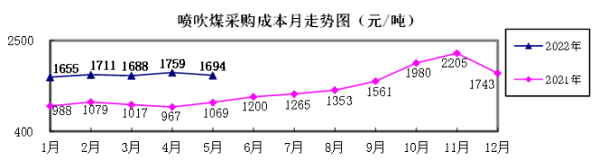 噴吹煤5月份加權(quán)平均折算成干基的采購成本為1693.75元/噸,環(huán)比下降65.72元/噸,降幅為3.74%。1-5月累計平均折算成干基的采購成本為1678.70元/噸,同比升高654.37元/噸,升幅為63.88%。