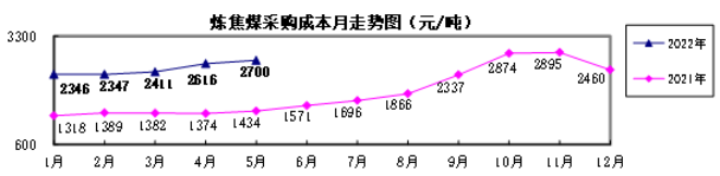 對標(biāo)企業(yè)煉焦煤5月份加權(quán)平均折算成干基的采購成本為2699.74元/噸,環(huán)比升高83.76元/噸,升幅為3.20%。1-5月累計平均折算成干基的采購成本為2485.87元/噸,同比升高1106.22元/噸,升幅為80.18%。